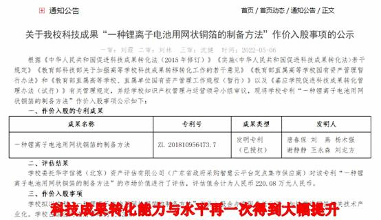 (三)两年来,学院共授权发明专利4项,占全校授权发明专利总量的26.7%。一项科技成果“一种锂离子电池用网状铜箔的制备方法”成功作价入股。