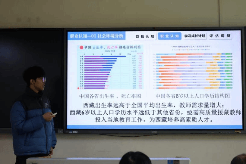 为增强学生职业规划意识,提升职业能力,学院于2025年11月19日在田师103举办第三届大学生职业规划大赛暨校赛选拔赛。现场赛分为“成长赛道”和“就业赛道”两个赛道,通过主题陈述、评委问答环节,12位学生结合专业背景,从自我认知、职业认知、职业目标与动态调整等方面进行生动展示。
